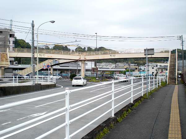 間もなく,国道一号線に戻ってくる。目の前の階段を上がり,歩道橋を通って国道の向こう側(駅のすぐ横)へ渡る(左・左写真=8:47)。