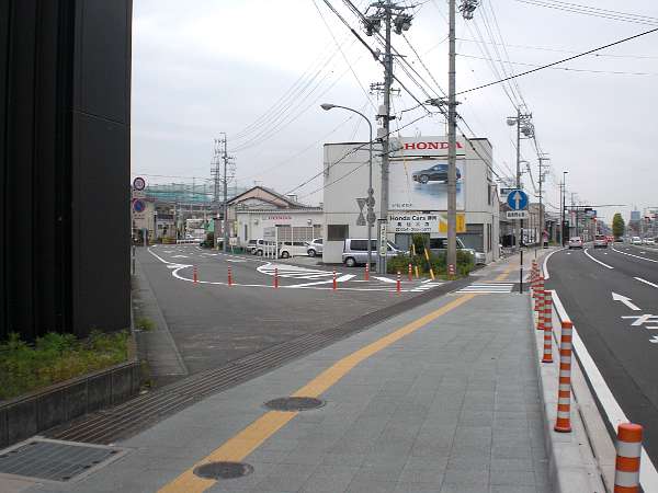 右へ折れたら国道の左側道を線路伝いに進む。線路から外れてすぐの所に「HONDA Cars静岡」があるのでその手前を斜めに左へ入る(左・右写真=8:54)。