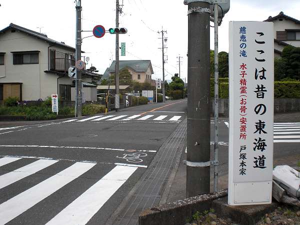 すぐにY字路に差し掛かる。道路上には直進が右手のように表示されているが,よく見れば左手が旧東海道として自然な流れである(左・右写真=8:37)。
