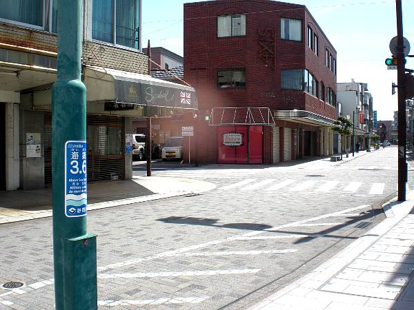 右手に折れたところからスタートする。商店街は時間が早いせいか人通りはない(右・左写真=9:15)。ここが江尻宿の中心街である。