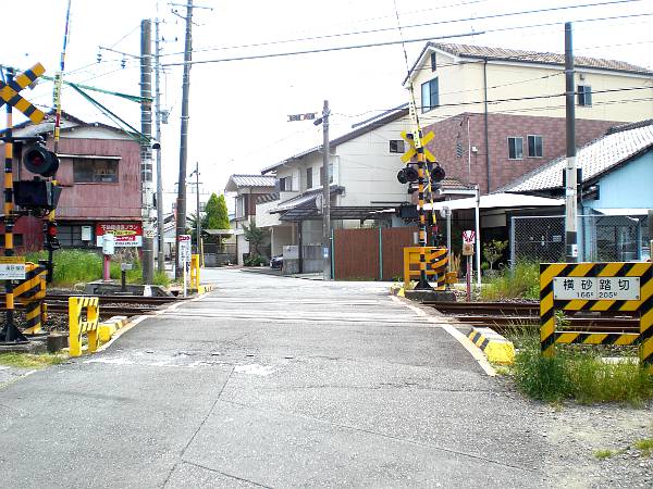 行動沿いを100mあまり進むと踏切が見えてくる(左・左写真=11:32)。