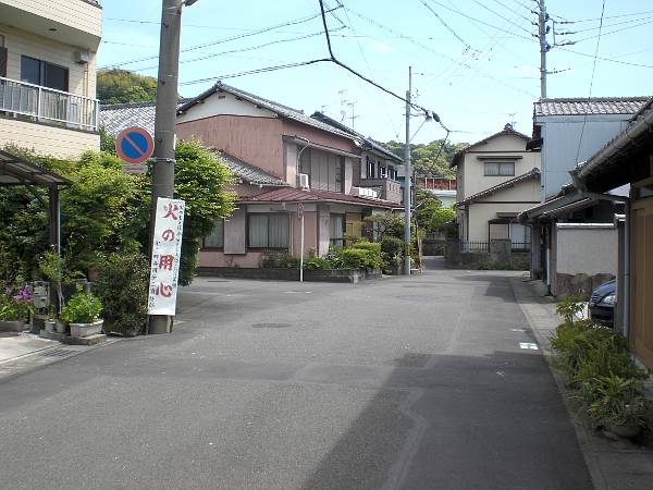 五叉路の交差点を越え,左斜めの細い道に入る(右・右写真=17:58)。