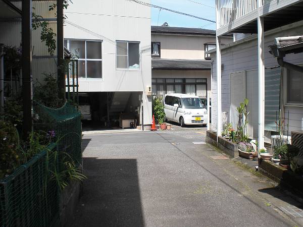 橋から二筋目,マンションと民家の間(赤いシャッターの前)を右へ入る(左・右写真=17:53)。
