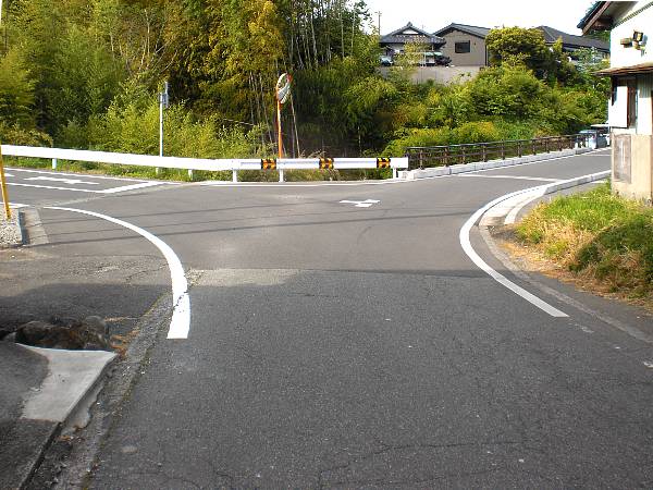 その先少し右にカーブして橋を渡ると三叉路があり前方に県道との合流が見える(右・右写真=15:10)。ここを左折する。