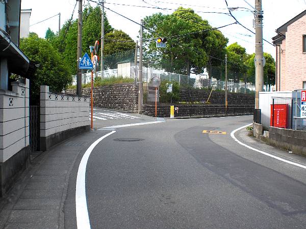 住宅街へ入ってしばらくするとY字路に差し掛かる(右・左写真=15:34)。右は車用の迂回路で理由はこの先分かる。