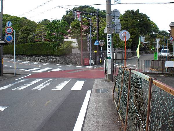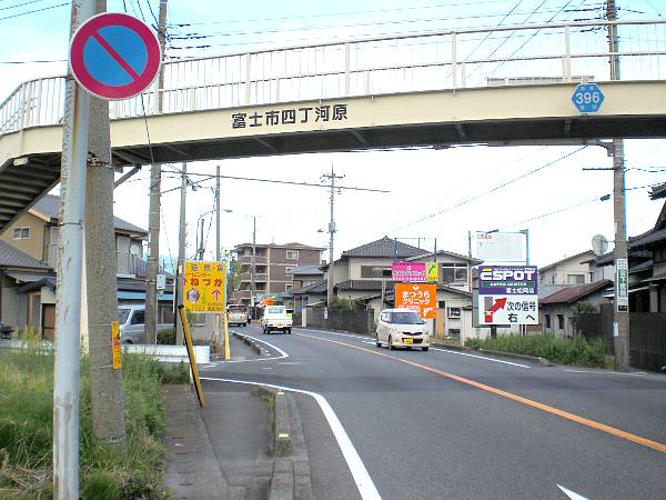 橋を渡って5,600m,歩道橋に[富士市四丁河原]と書かれた小さな交差点を左に入る(左・左写真=16:56)。