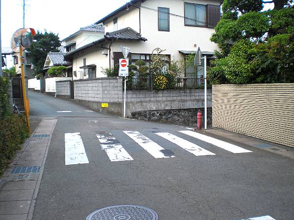 県道を左へ取り400mほど進むと左手に上り階段,その下に横断歩道があるところに来る(右・右写真=13:09)。旧東海道はここを右へ細い路地に入る。