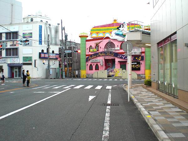 直進すると「アラビアンナイト」と書かれたピンクの建物がある交差点[中央駅]に来る(右・左写真=18:17)。