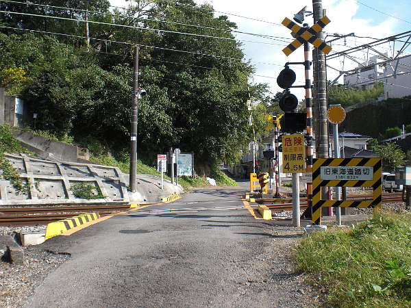 ピンク色の住宅を回り込むように登って行くと、東海道本線の[旧東海道踏切]がある。この辺りから「