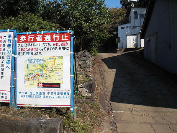 しばらく側道を夏のような日差しに照らされながら上って行くと「三島スカイウォーク」という施設の駐車場入口に来る。正に、その入口の筋向かいに旧東海道が出て来る。(右・右写真=12:24)