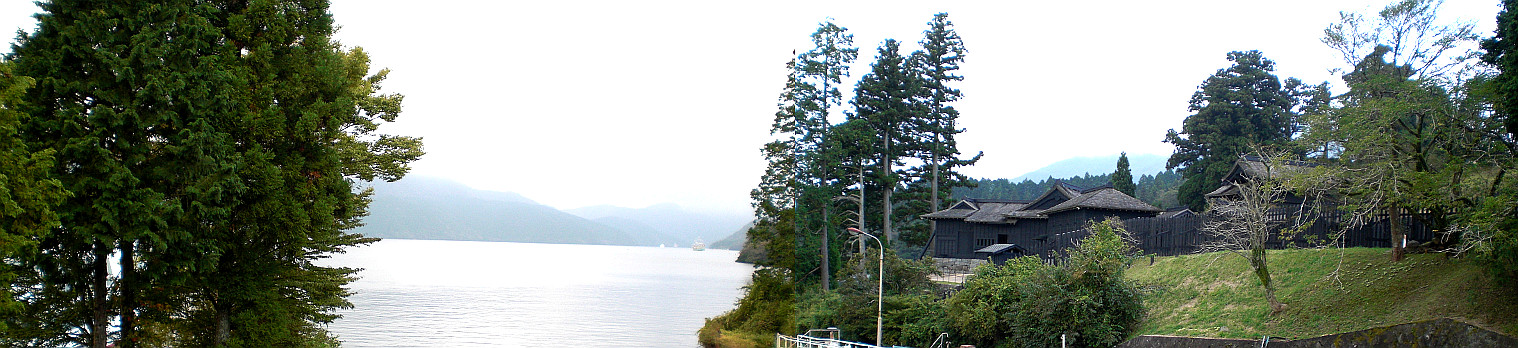 箱根関所跡港から芦ノ湖に浮かぶような「箱根関所」を望む