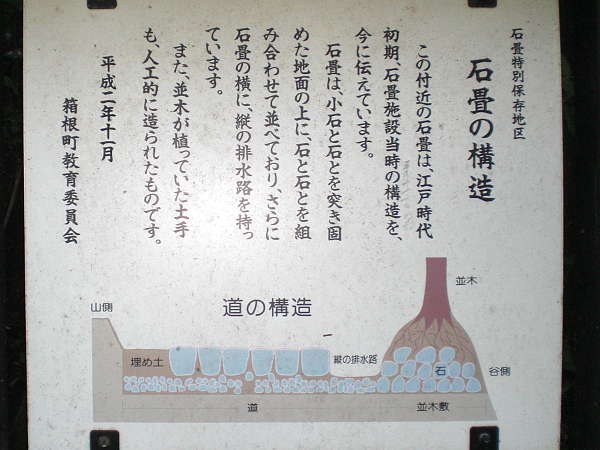 しかし、街道の構造を調査した結果が案内板として掲げられていたので、今後の参考にと掲載した。(左・左写真=8:21/箱根町教育委員会)
