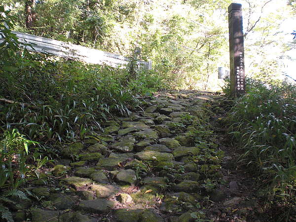 箱根旧街道(旧東海道)ではほとんどの所で、仮に国道のような車道であっても、このように側道として石畳の歩道が整備され旅人を迷わせない工夫が施されていた。