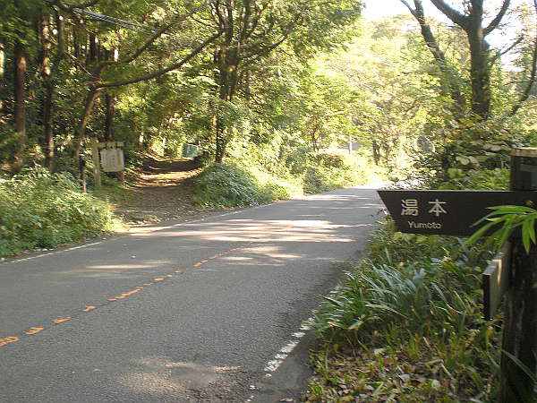 <湯本 の標識が有り、筋向かいに旧街道が有る。(右・左写真=8:29)