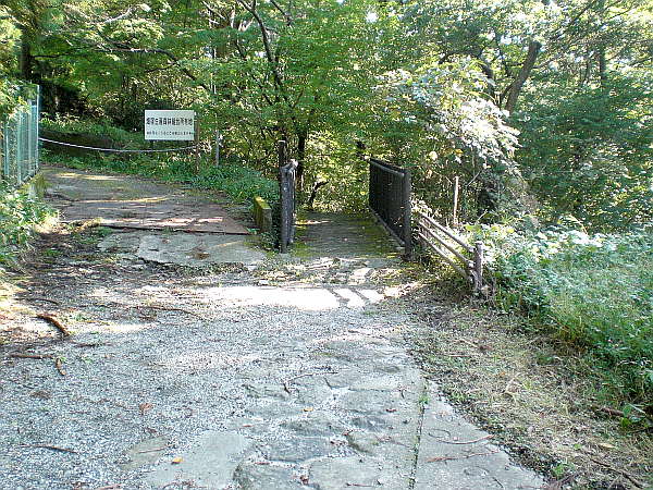 谷間の小橋を渡って少し荒れた石畳を上ると上に県道への合流点が見えてくる。(左・右写真=8:25) この急坂は先ほどの構造図どおり道路脇に排水路が確認できる。