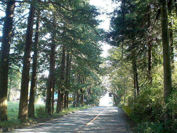 間もなく湯本の街、立派な杉並木が残されている。(右・左写真=9:03)