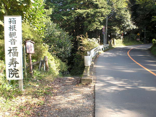 箱根観音 福寿院]と言う看板が道路左に見えてくる。ここから車道を離れて、谷へ下るように進む。(右・右写真=9:28)