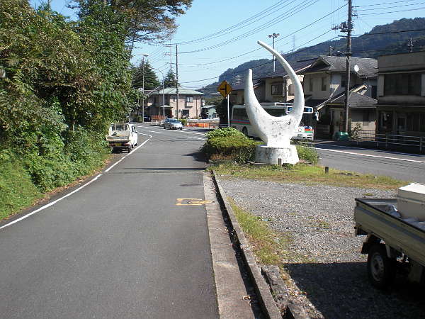 ここでは、500m程で一風変わったモニュメントの有る所で、再び国道に合流する。(右・右写真=10:46)