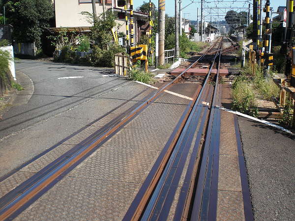 小田原と強羅を結ぶ本線は少し先に見える「入生田駅」から「箱根湯本駅」が狭軌(1,067mm)と広軌(国際標準軌:1,435mm)を併設した三線軌条となっている。