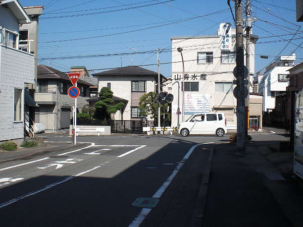 交差点向こうの少し先を右手へ向かっているのが旧東海道である。しかし今は渡しが無い為国道沿いへと右折する。