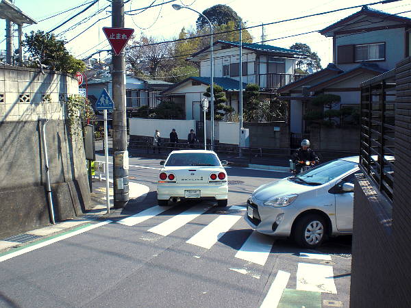 交差点は要注意、通勤時間帯なのとかなりの高台から下ってくる車は容易に泊まってはくれない(右・右写真=8:03)。