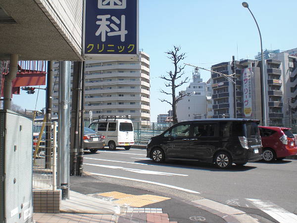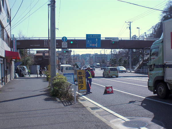 街道は緩やかに高台に登って行く。間もなく横浜駅前から続く広い道路の上を跨ぐ「