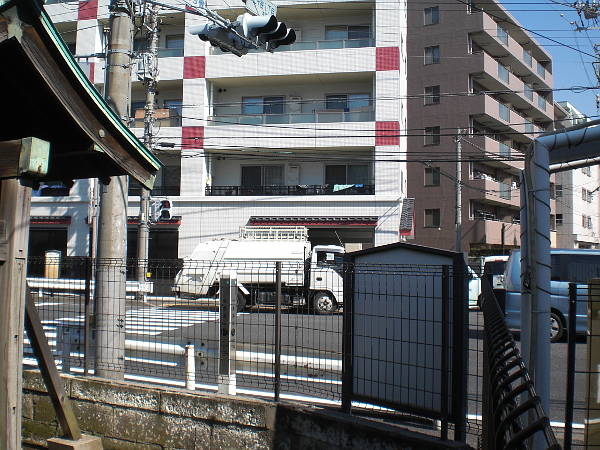 環状1号に再び合流、というより旧東海道は正面のマンション右横「宮前商店街」に向かって直進していた(右・左写真=11:34)。