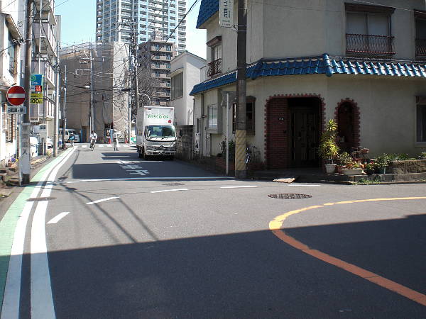 1キロほど歩くと、センターラインが右折して広い道路に出てしまう所に来る(左・右写真=10:50)。ここはそのまま真っ直ぐ一方通行の方へ進む。