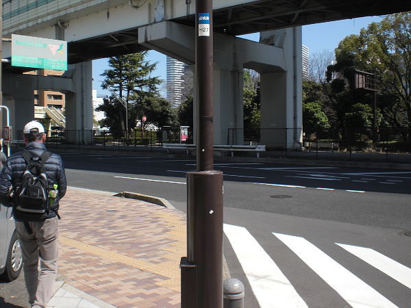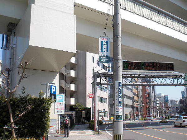 いくつか信号のある交差点を過ぎると、環状1号の上を首都高速が通っている(左・左写真=11:11)。