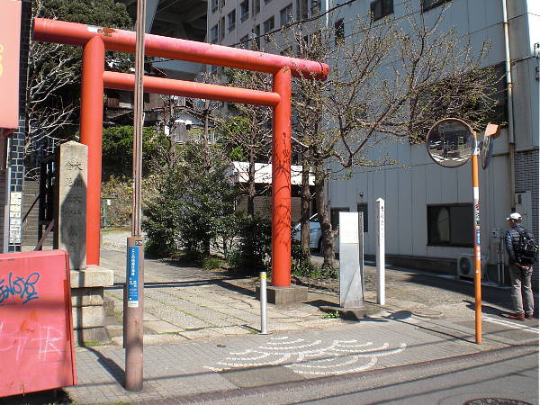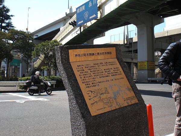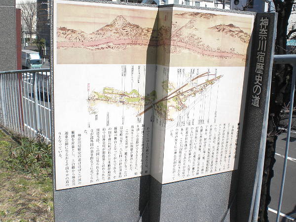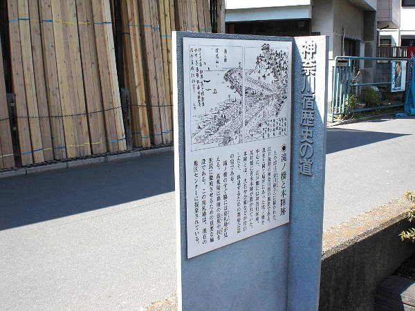 神奈川新町駅付近の交番と大勝軒というそば屋の間を一筋入ると、「神奈川宿入口土居(枡形の一種)絵図」が掲示されている道標が立っている(右・左写真=13:08)。