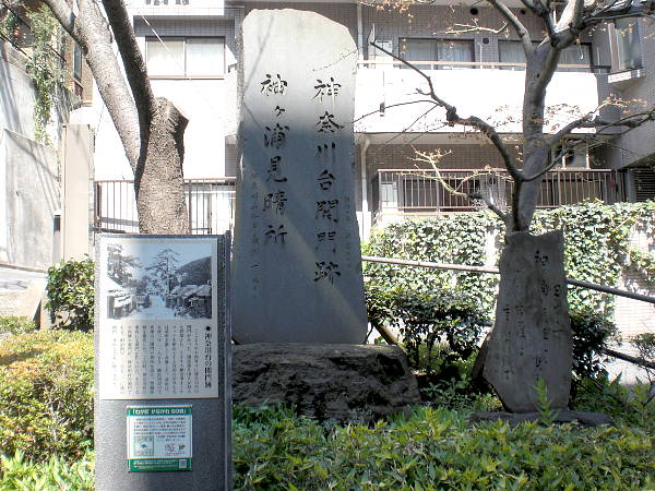 さらに上って行くと峠手前に「神奈川台関門跡の碑」が有る(右・右写真=11:25)。実際は少し西寄りであったようである。鶴見橋関門と共に東西両側に設けられた様だ。