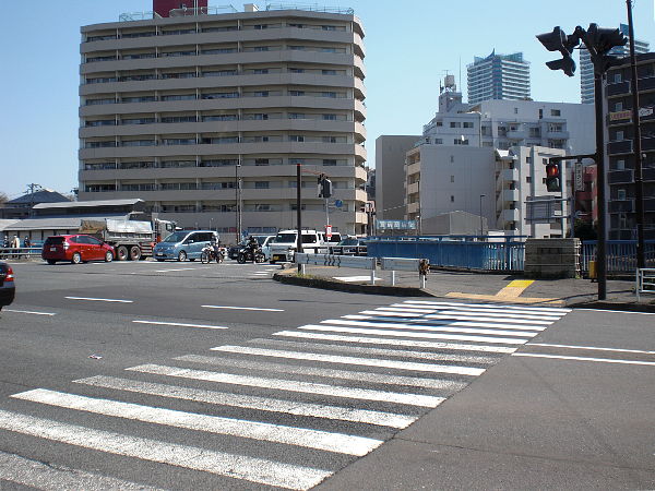 左に迂回して[青木橋]交差点の歩道を橋の方へ渡り、橋のたもとをすぐ左方向へ国道一号線を渡る(右・右写真=11:35)。