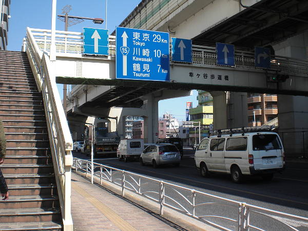少し行くと国道409号と交叉[本町]し、さらに進むと国道15号(第1京浜)の低いガードが見えてくる(右・右写真=16:11)。このガードをくぐって国道の右側を堤防から下りてくる車道の側道を上る。