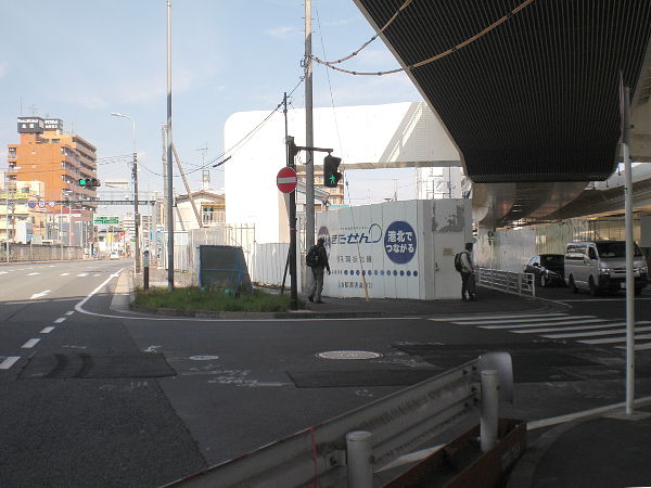 左へ進んだので右手に見える水色の歩道橋を渡り環状1号に合流する(右・右写真=10:52)。