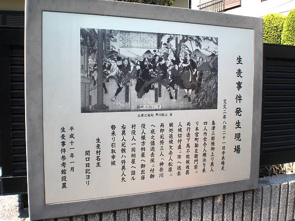 さらに、信号のある交差点を越えて一筋目の丁字路角付近の民家(左側)に「生麦事件発生現場」の案内板が掲げられている(左・右写真=14:15)。