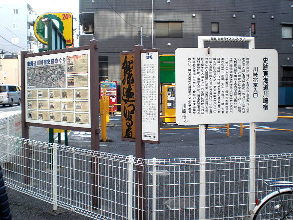 川崎宿 京入口」の案内板が立っている(右・左写真=15:41)。