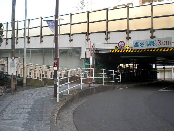 これをくぐるとすぐに有るのが[西口ランプ入口]という交差点。ここを斜め左に脇道へ入る(左・右写真=11:12)。(「そば処」の広告の有るビル裏手へ)