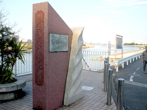 明治天皇六郷渡御碑」と記された石碑が有り、資料に依ると多摩川に舟23艘を横に並べ、
