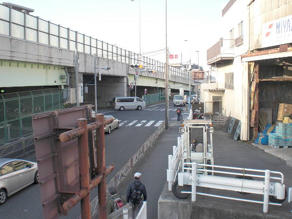 土手上から[六郷土手]交差点と、15号線の高架を望む(右・左写真=16:24)。このまま15号線に沿って行けば本日の終点「蒲田駅最寄り」となる。
