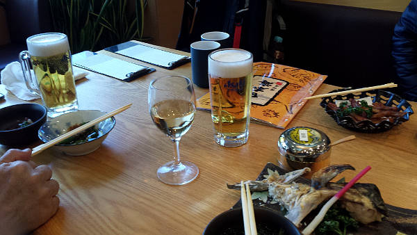 前方に京急空港線の高架が見える[南蒲田]交差点を過ぎた辺りで、夕食にする事となった(右・右写真=17:00~19:20/36672歩)。
