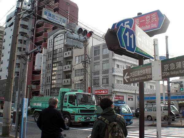 ちょっと肌寒いがまずまずの天気。昨晩ほろ酔いで到着した[東蒲田二丁目]の交差点から出発(左・左写真=7:45)。