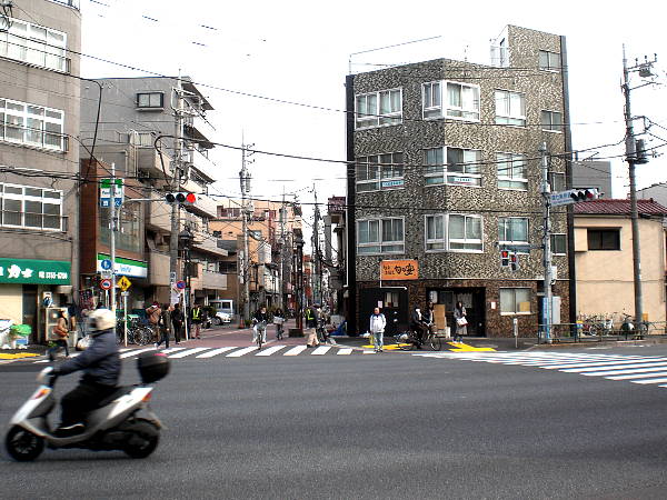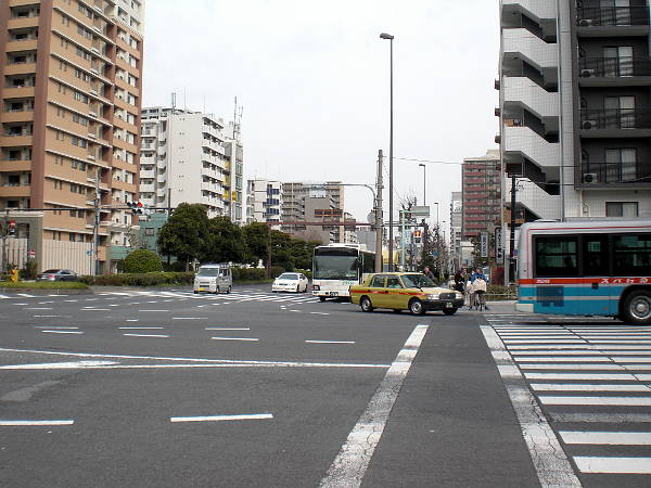 [芝四丁目]交差点(左・右写真=11:34)。 左斜めに進む(北へ折れる)