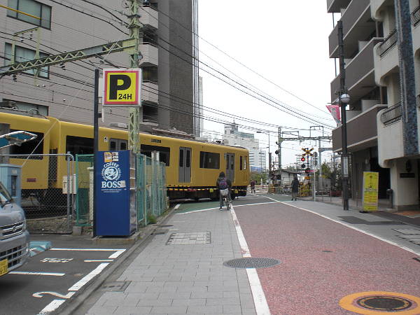 電線・電柱の全くない品川宿を道なりに進んで行くと、左から京急本線が平面交差してくる(右・左写真=10:32)。