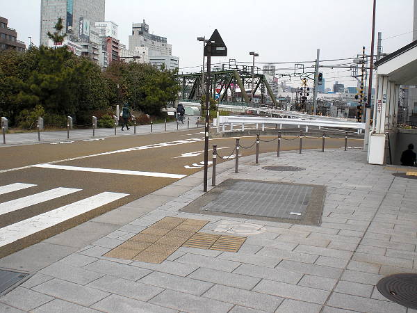 前方に15号線から首都高速へ入るランプウェイが見えて来る。その下で右手から15号線に合流する一方通行の車道が旧東海道である(右・右写真=9:12)。