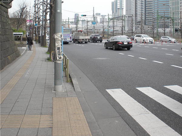陸橋に続く15号線の交差点[八ッ山橋]も歩道を渡り、15号線左側歩道を歩く(左・右写真=10:38)。当初は右歩道を行く予定であった。史跡(