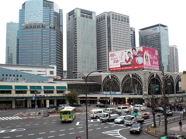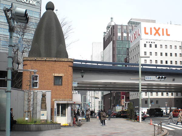 [品川駅前]交差点の歩道橋を渡る。何度か乗り降りしたが高輪口側の駅舎は初めて見た気がする(右・左写真=10:47)。