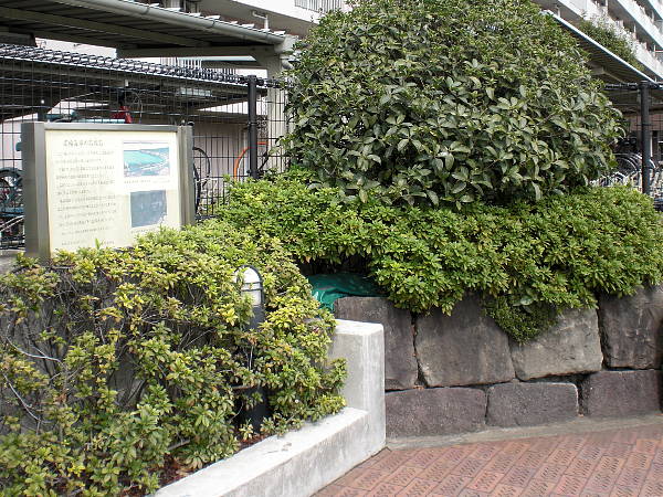[高輪二丁目]の歩道を渡ると角に石垣が有る(右・右写真=10:57)。一つ先の[泉岳寺]右手辺り(高輪二丁目20番)で1995年の発掘調査で見つかった高輪海岸の石垣である。3段目から下はそのまま現地で保存されている。