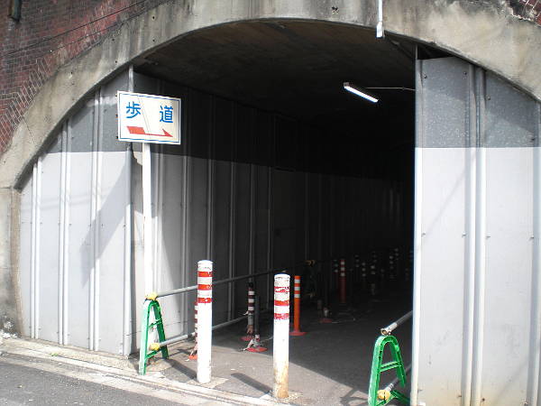 山手線のガード下は歩道が無く、20mほど左へ行くとトンネル歩道が有る(左・左写真=12:35)。